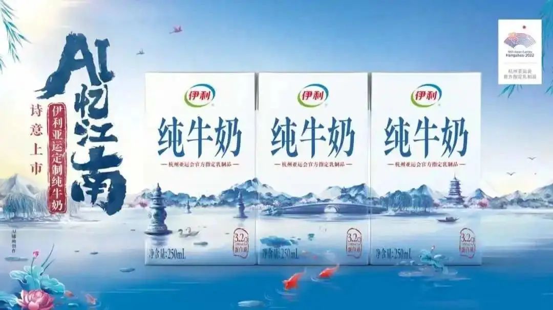 613日,在杭州亞運會倒計時100之際,伊利推出「亞運定制純牛奶」AI憶江南限定系列包裝。產品以AIGC技術輔助包裝設計,通過科技感、自然生機、東方美學、未來感、極簡和童真”6個關鍵詞,讓傳統古典美與前沿科技充分碰撞,給消費者帶來全新視覺體驗。