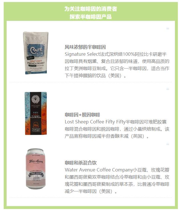 消費者希望在享受咖啡的味道、香味和飲用習慣的同時避免攝入咖啡因后的精神緊張,這種需求推動低因咖啡趨勢的發展。?隨著咖啡飲用者更注重健康需求,咖啡品牌需要變通適應,例如推出各種低因咖啡產品(如"半脫因"研磨咖啡),探索天然低因咖啡,甚至考慮在普通咖啡中加入植物成分以弱化咖啡因效果。