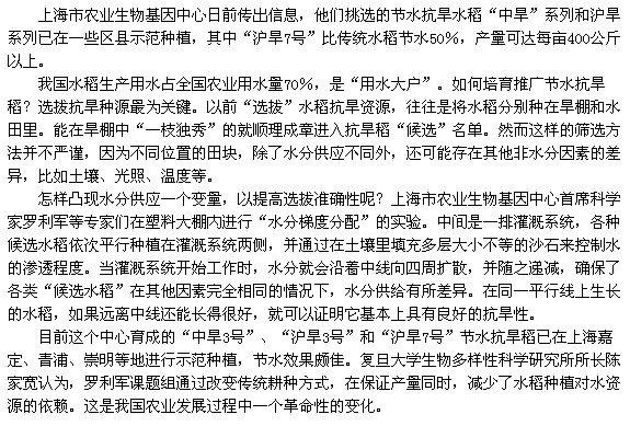 上海選出節水百分之五十的抗旱新稻種
