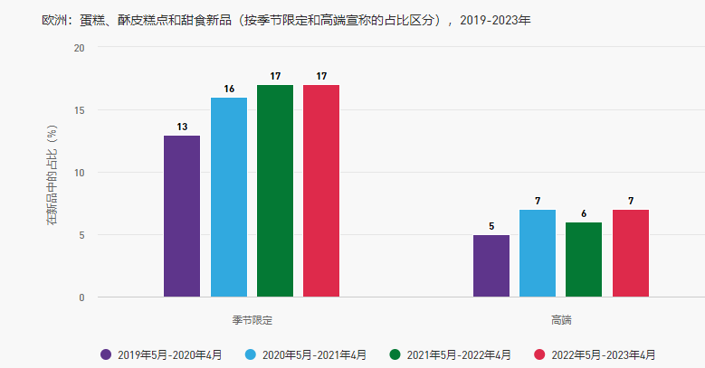 2023年,季節限定產品在所有蛋糕、酥皮糕點和甜食新品中的占比為17%。近年來,季節限定細分品類中的高端產品的占比穩步增長。這表明,品牌可以借助季節性慶祝活動的機會,鼓勵消費者在購買蛋糕時進行消費升級。其中許多新品是具有新穎風味的傳統慶祝蛋糕,或者采用季節限定風味的年度熱銷產品。