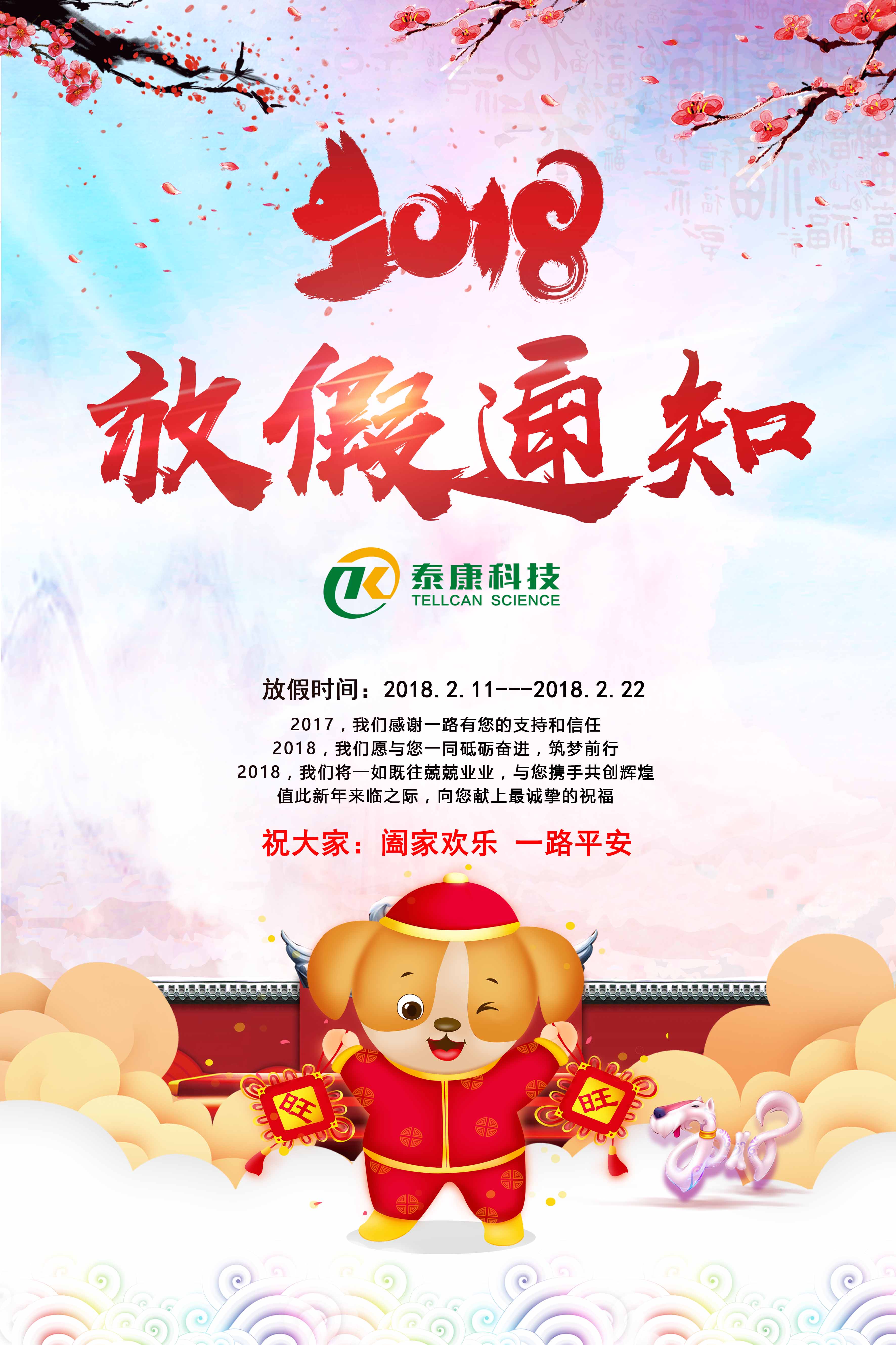 放假時間:2018年2月11日至2017年2月22日,共12天,2018年2月23日(大年初八)正常上班。放假期間不安排員工值班,給您帶來的不便,敬請原諒。